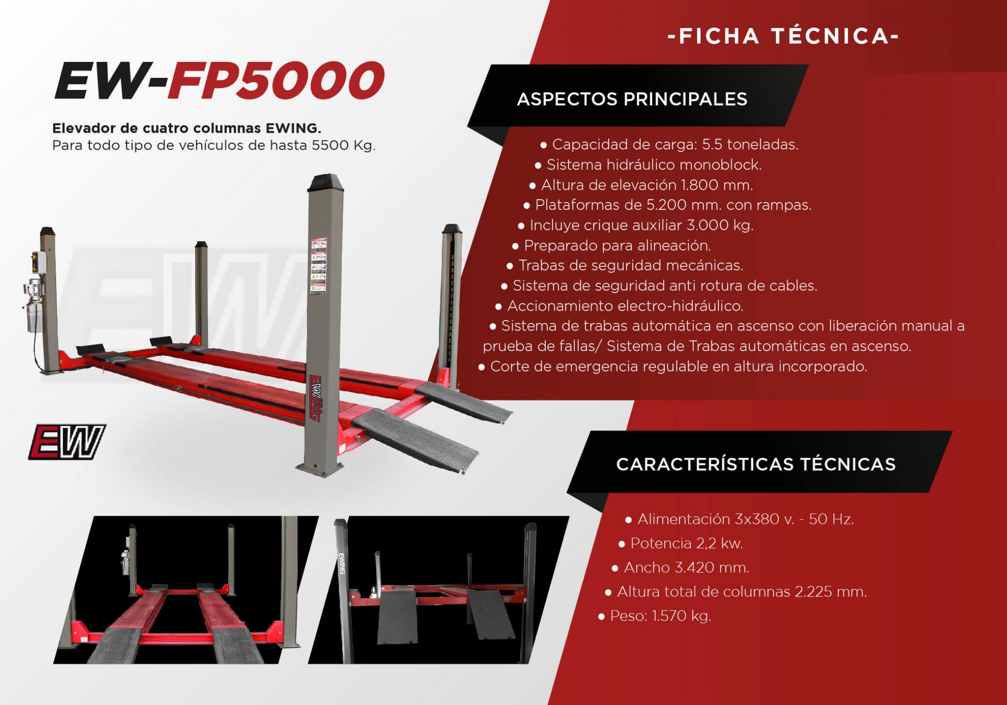El elevador EW-FP5000 es nuestro elevador de cuatro columnas apto para alineación. Pensado para todo tipo de vehículos de hasta 5.5 TON.