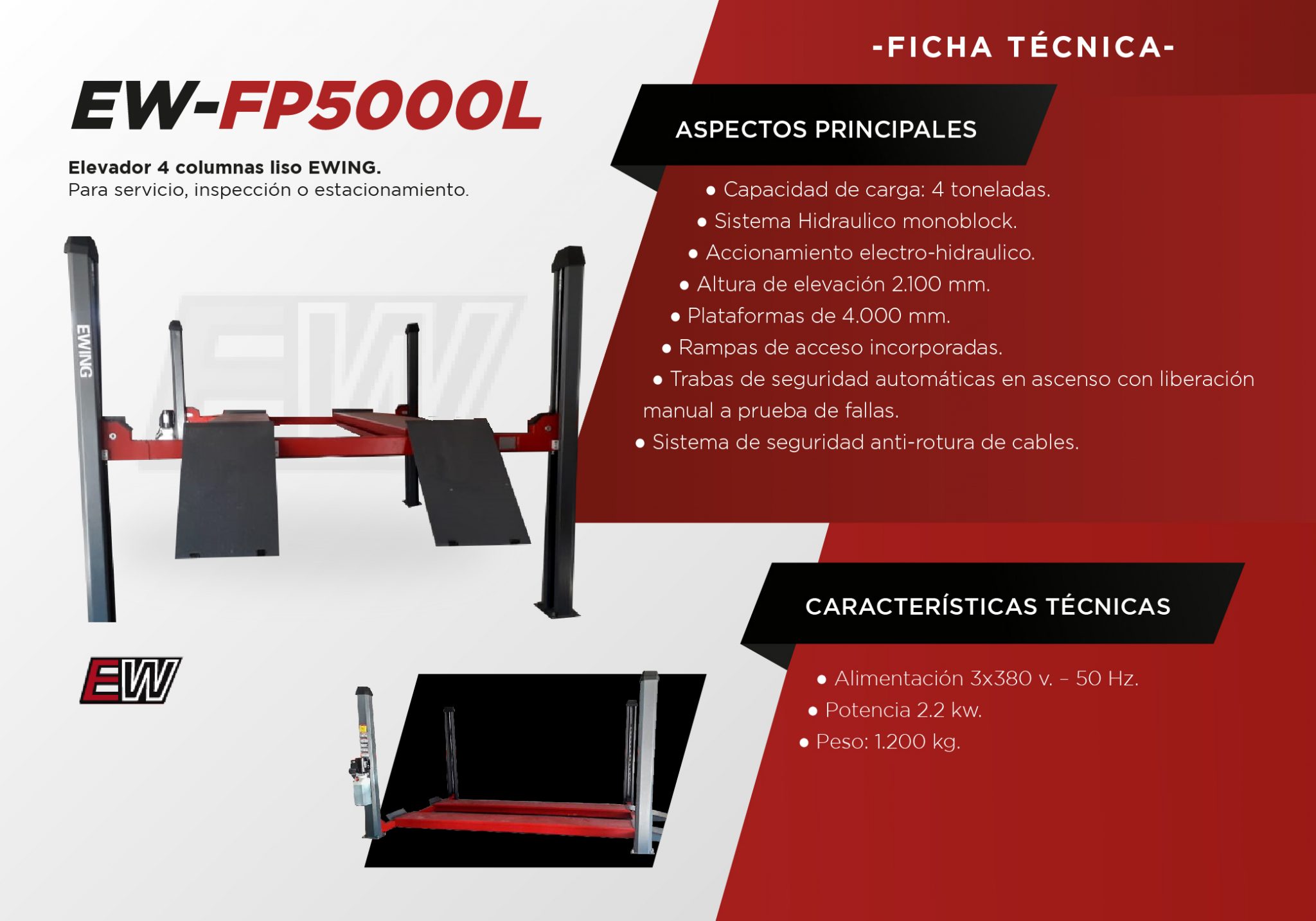 El EW-FP5000L, al igual que todos los elevadores Ewing, cuenta con múltiples sistemas de seguridad como sistema de guía de cables anti rotura, sistema de trabas automáticas en ascenso, switch de corte por seguridad, sistema monoblock de bomba, liberación de trabas mecánicas por sistema directo, entre otras.