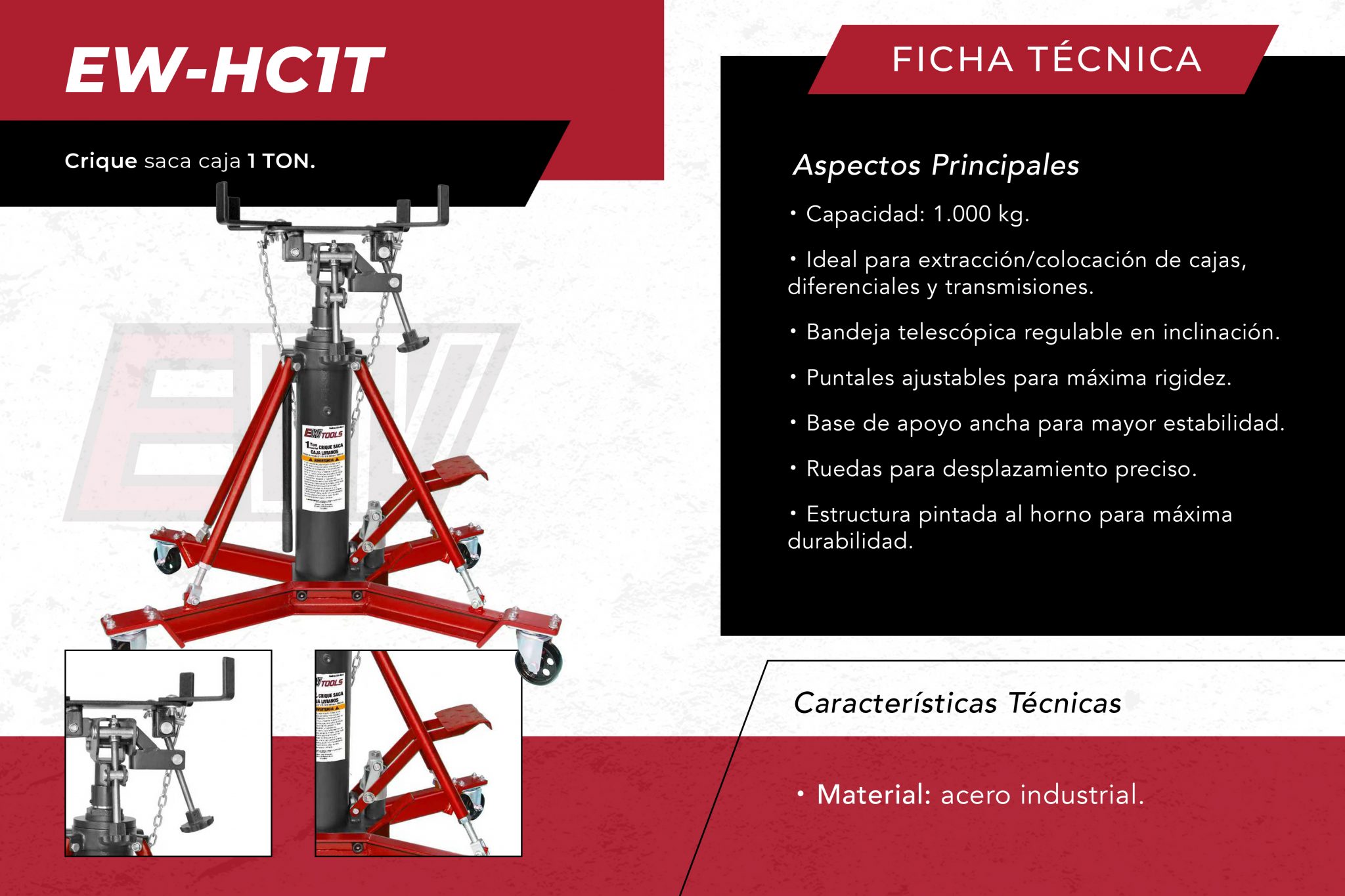 Nuestra EW-HC1T es nuestro Crique saca caja profesional para talleres con capacidad de 1 TON. Es una incorporación reciente en nuestra línea de equipamiento EW TOOLS® en la que la filosofía sigue siendo la misma de siempre poder brindarle un producto de calidad y robustez a los talleres y gomerías. Está pensado para poder retirar y/o colocar cajas de velocidades, de transferencia, diferenciales y otros componentes del vehículo con seguridad y sin correr riesgo de rotura tanto de los componentes como de los operarios.
