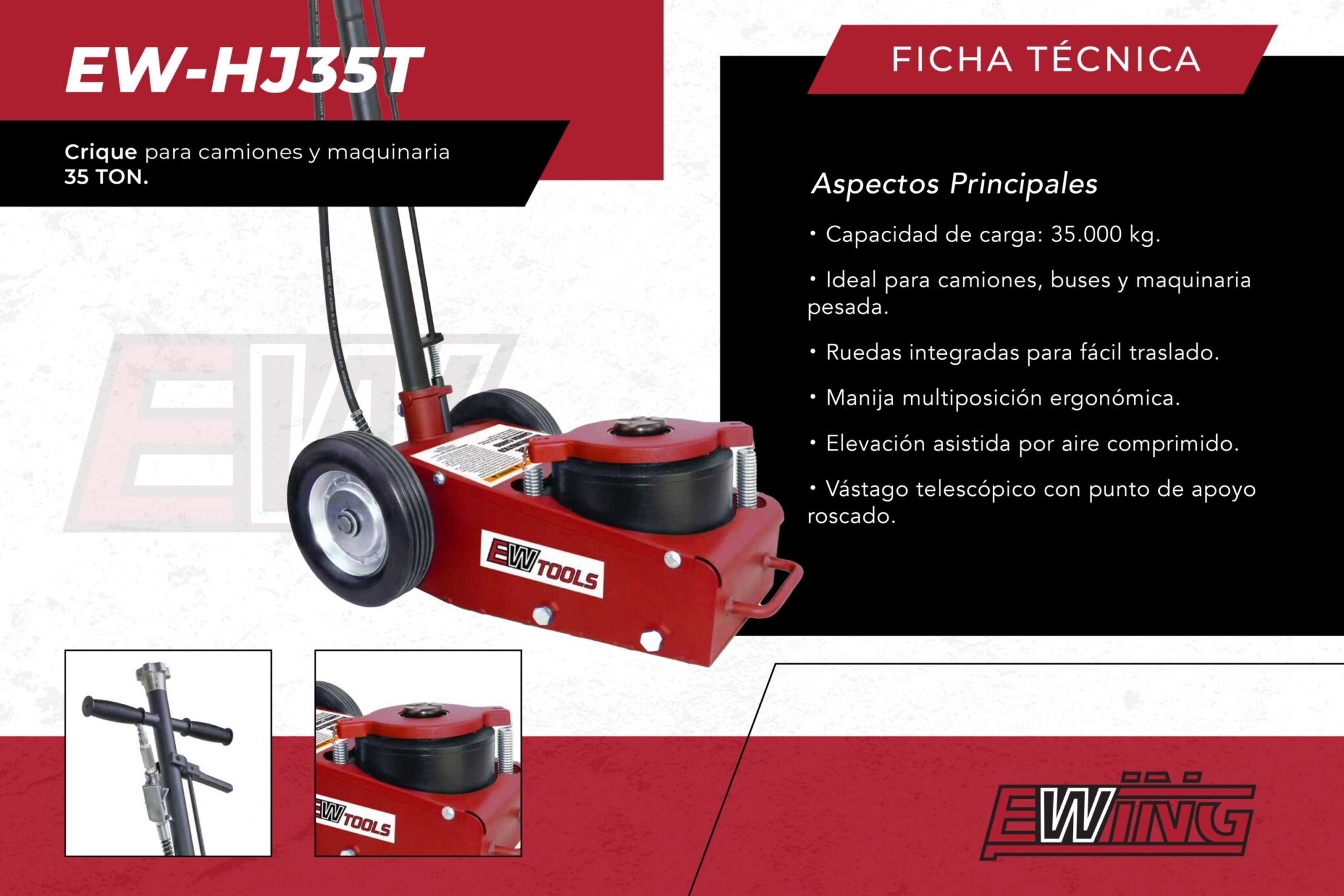 Nuestro EW-Hj35T es nuestro crique carro para servicio pesado. Con una capacidad de 35 TON, está pensado para trabajar con camiones, buses, tractores y maquinaria pesada. Es una incorporación reciente en nuestra línea de equipamiento EW TOOLS® en la que la filosofía sigue siendo la misma de siempre poder brindarle un producto de calidad y robustez a los talleres y gomerías.