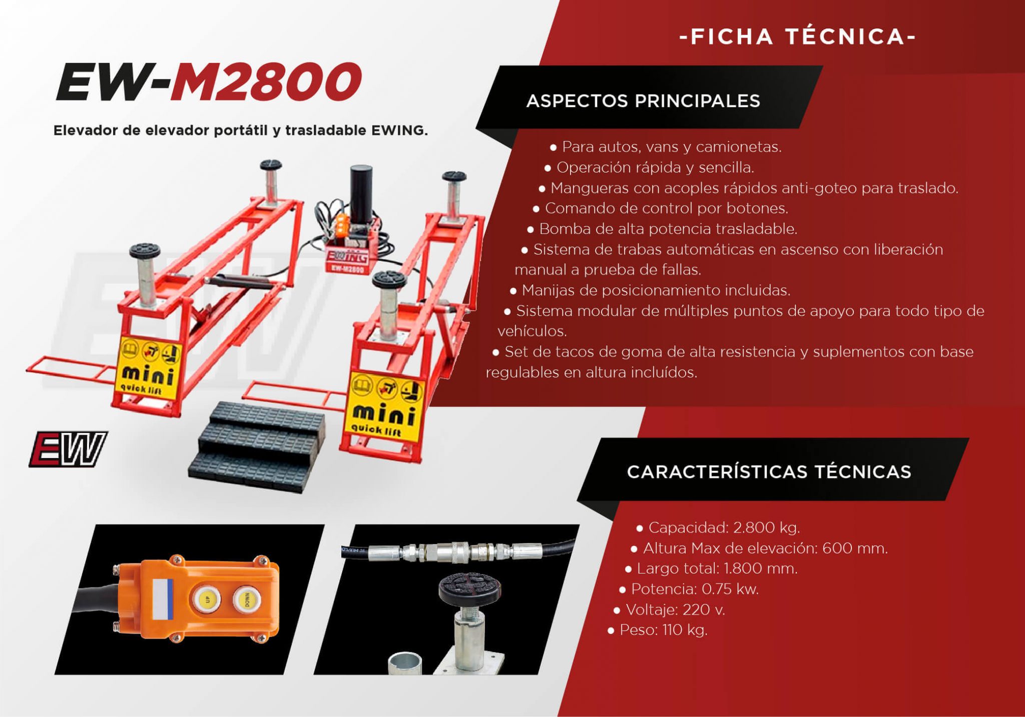 El elevador EW-M2800 es nuestro elevador portátil y trasladable. Simplemente conecte sus mangueras con acoples rápido antigoteo, conéctelo a la red de suministro eléctrico y posiciónelo debajo del vehículo para poder así contar con la practicidad y velocidad para trabajar sobre el vehículo de manera cómoda y segura.