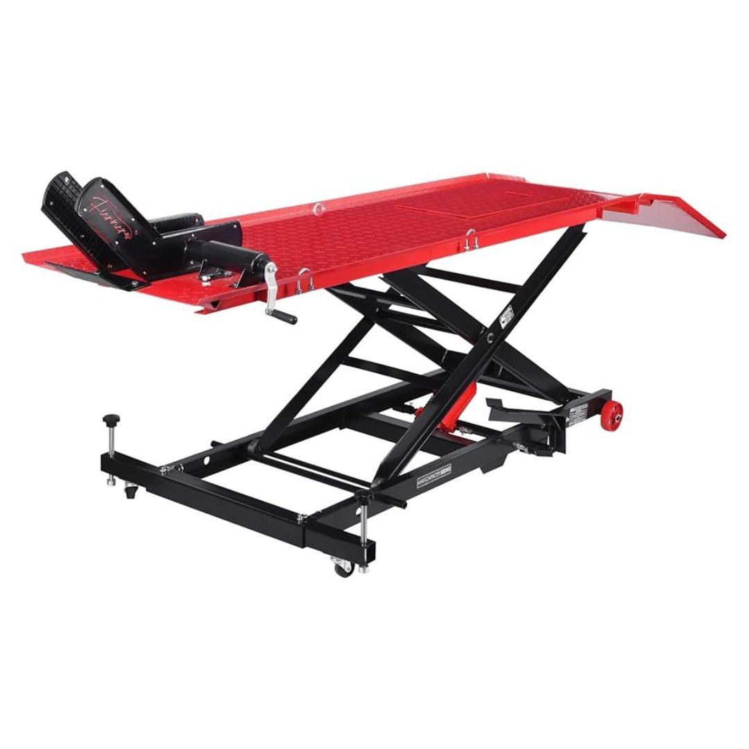 El sistema de elevación por pedal hace que el equipo sea cómodo y fácil de operar y que el usuario cuente con múltiples niveles de parada para poder decidir la altura más cómoda según el trabajo que vaya a realizar. El equipo cuenta con sujeción para la rueda delantera y con diferentes puntos de anclaje a los costados para poder sujetar con sunchos la moto hacia los lados.