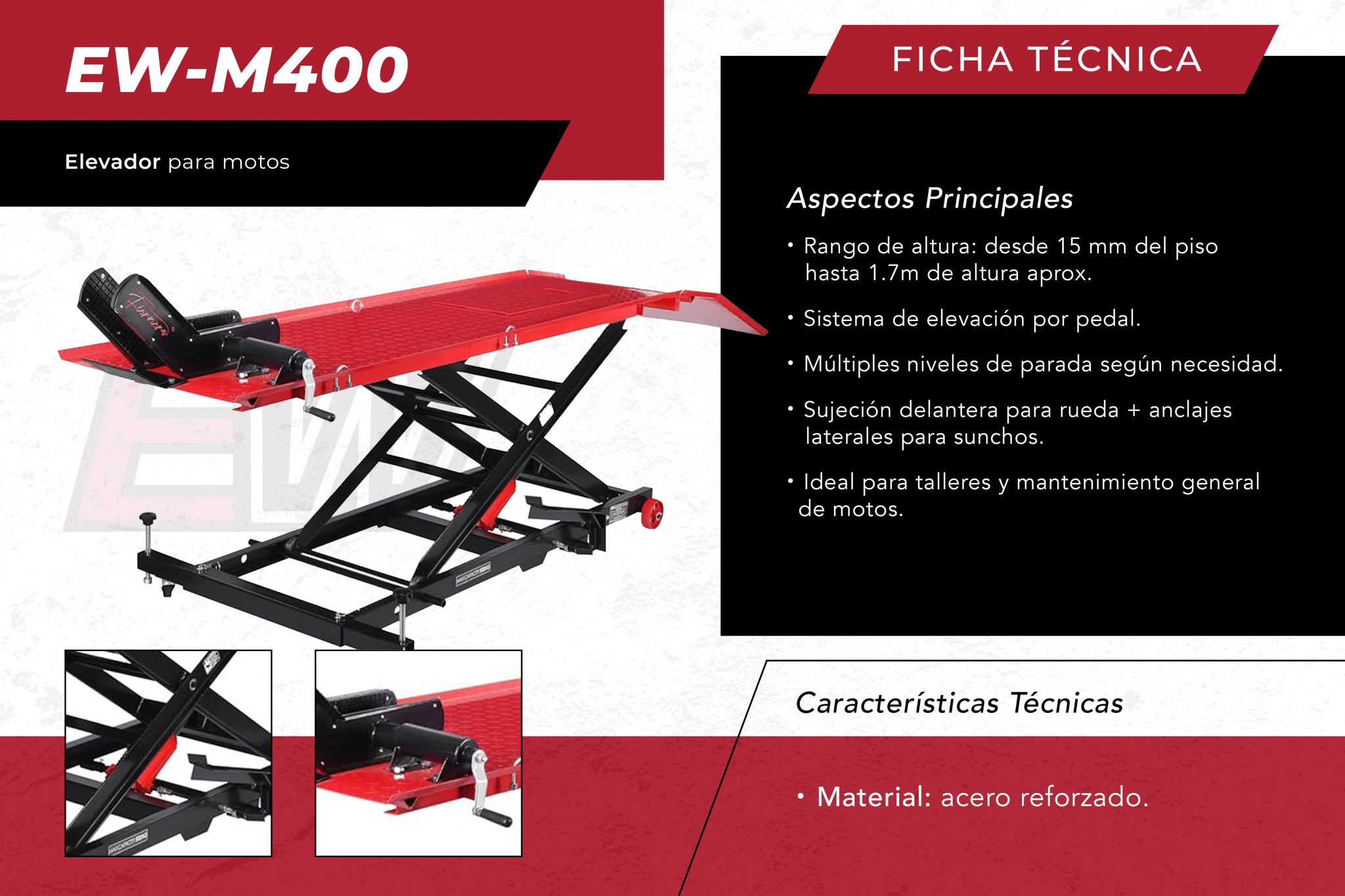 El elevador EW-M400 es nuestro elevador de entrada de línea para poder trabajar con Motos. Este equipo le ofrece al usuario la posibilidad de trabajar con motos a la altura que desee desde 15mm del piso hasta 1,7 mts de altura aprox.