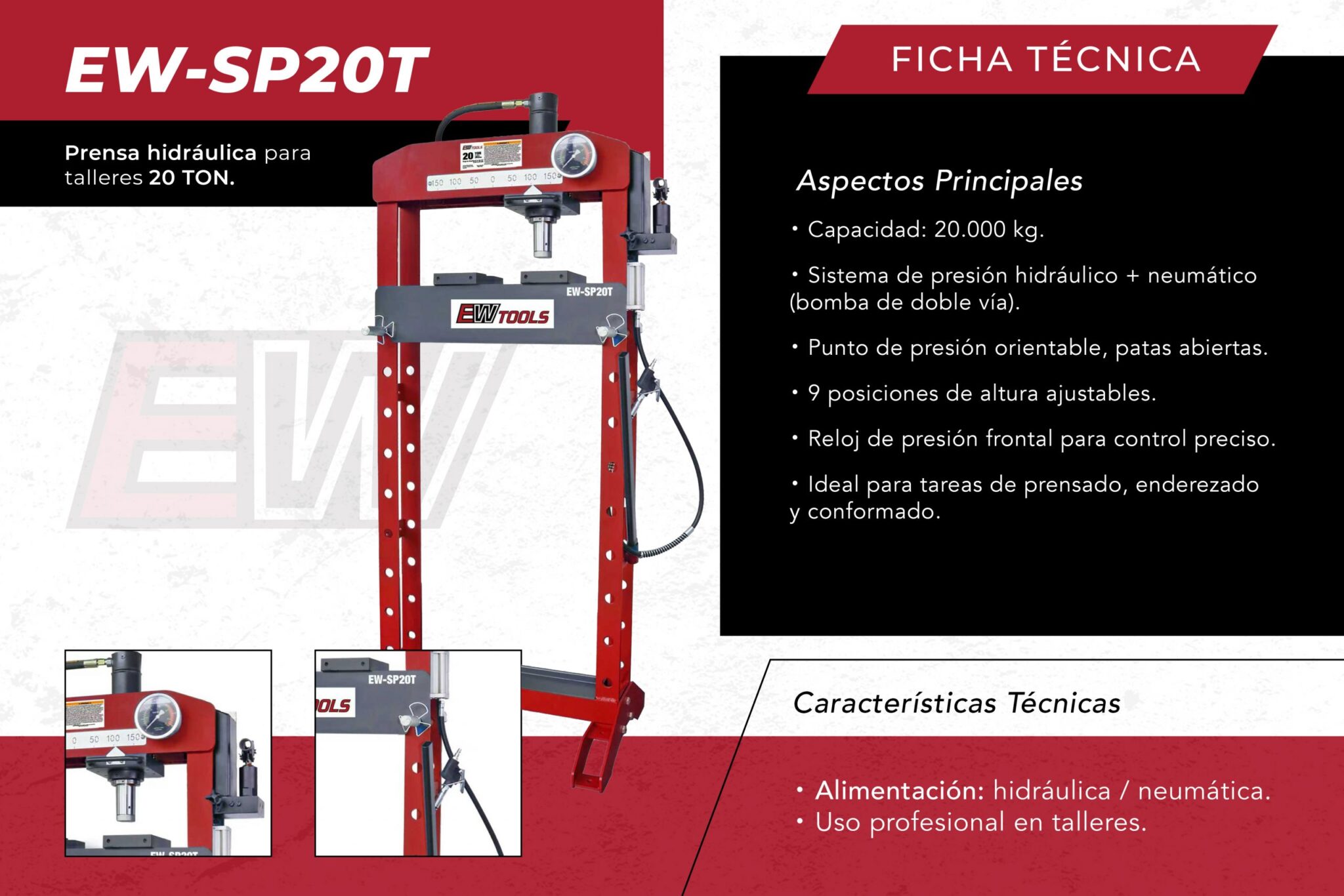 Nuestra EW-SP20T es nuestra prensa profesional para talleres con capacidad de 20 TON. Es una incorporación reciente en nuestra línea de equipamiento EW TOOLS® en la que la filosofía sigue siendo la misma de siempre poder brindarle un producto de calidad y robustez a los talleres y gomerías.