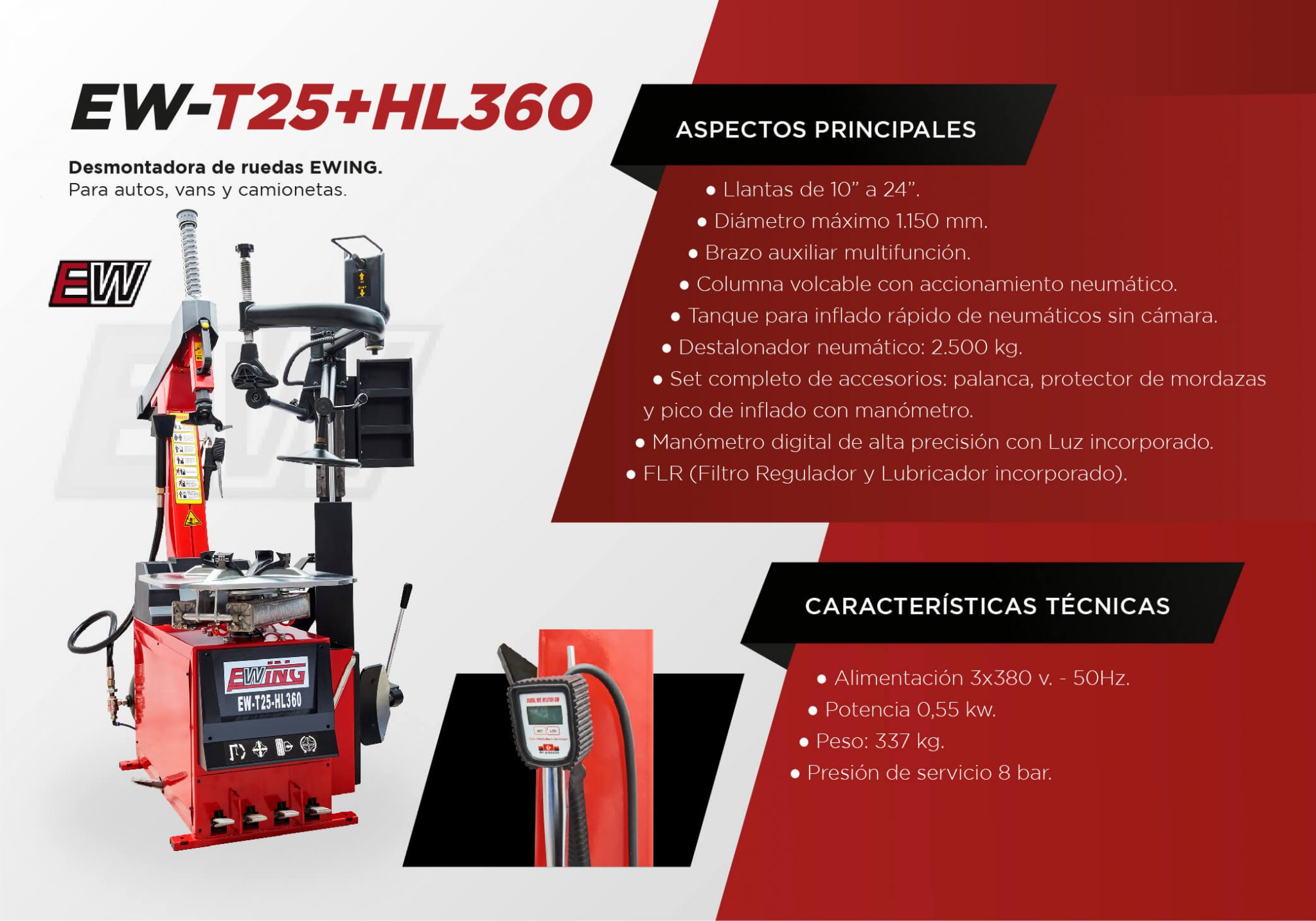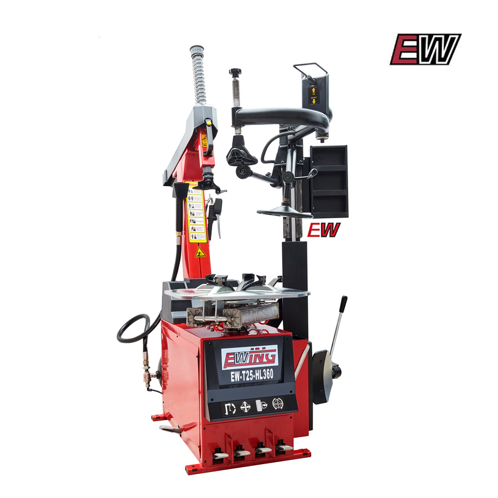 La desmontadora de neumáticos EW-T25+HL360 es la maquina ideal para trabajar con neumáticos de bajo perfil y del tipo RUN-FLAT. Pese a estar diseñada para trabajar con ese tipo de cubiertas, al contar con su brazo de apoyo multifunción de gran ángulo de apertura, le brinda al usuario la posibilidad de trabajar haciendo uso del mismo o simplemente aprovechar las ventajas de su columna volcable sin necesidad de utilizarlo pero contando con un gran espacio de trabajo para cualquier tipo de ruedas.