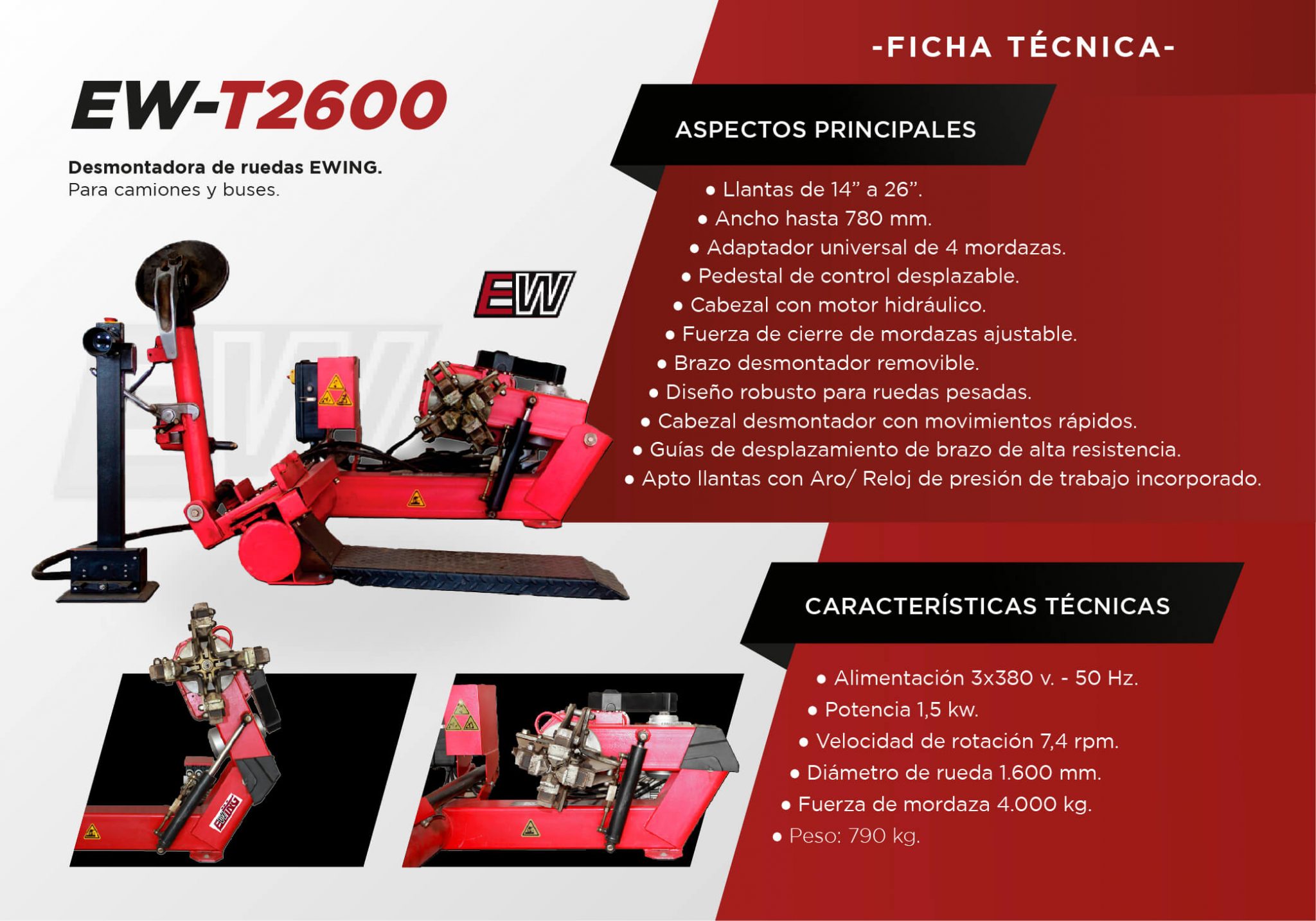 La desmontadora de neumáticos EW-T2600 es la maquina ideal para trabajar con ruedas de camiones y vehículos pesados con aro. Su Horizontal le permite desarrollar un largo recorrido para sus elementos de trabajo que están montados sobre un cabezal móvil. Este cabezal le permite trabajar tanto con uña como con plato haciendo mucho mas seguro el desarme de las llantas con aro.